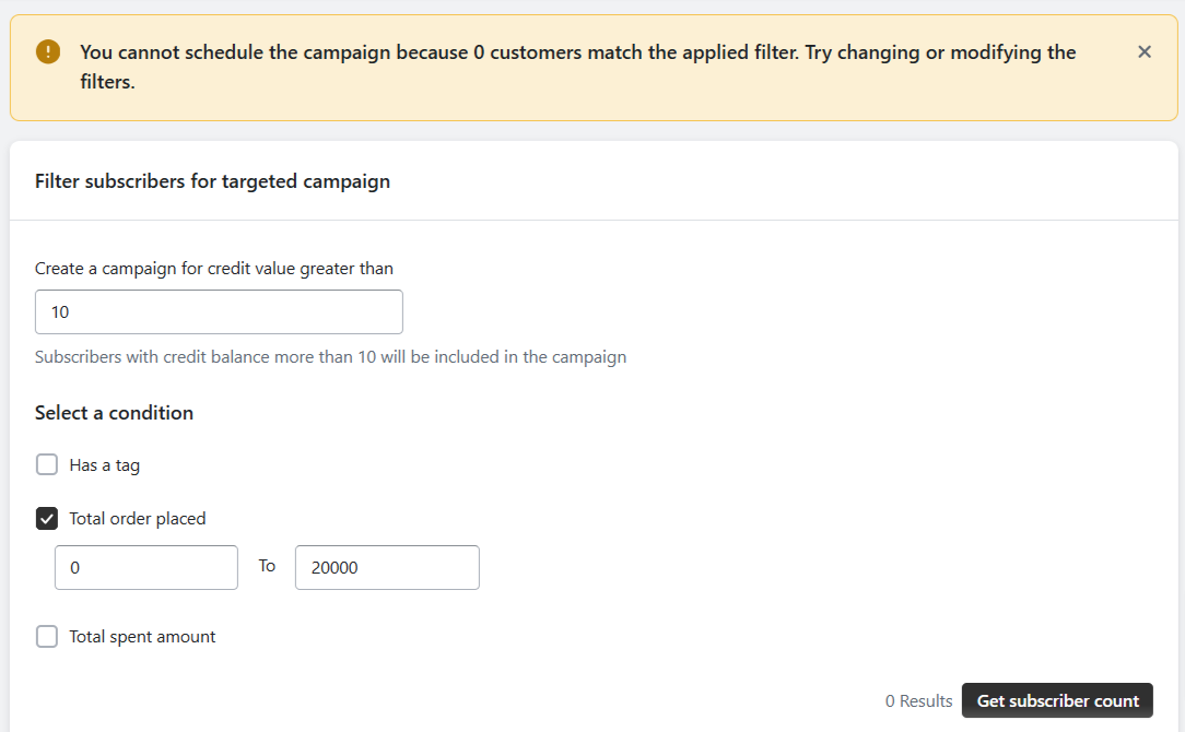 In the example below you can see that there are 2 results (subscribers) for the campaign set for subscribers who have more than 10 credits and have placed more than 0 and less than 20000 orders.