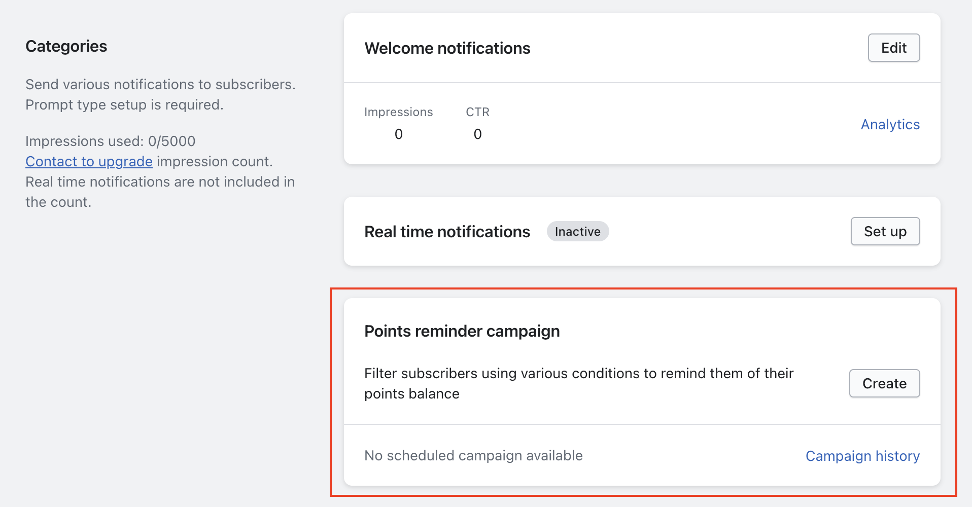 1. To run a campaign go to Loyalty program > push notifications > categories > Points reminder campaign