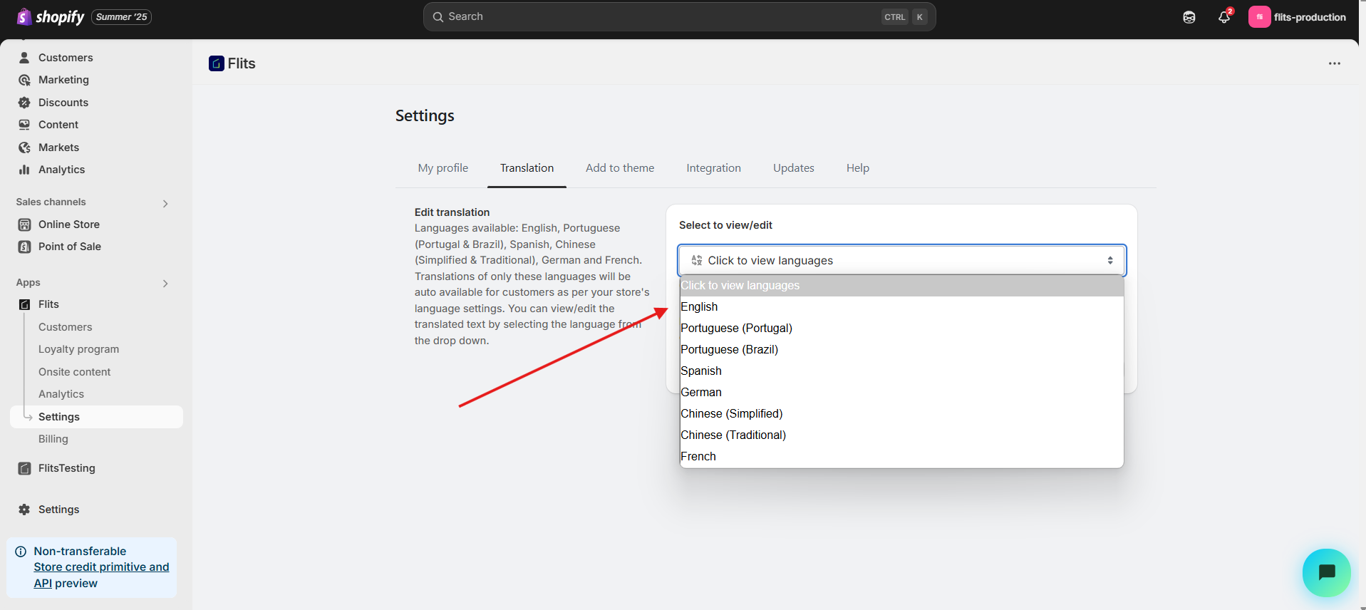 Flits offers 8 auto-translated languages for your storefront features. If you'd like to modify the default translations to better suit your needs, follow these simple steps.