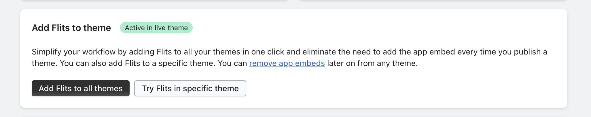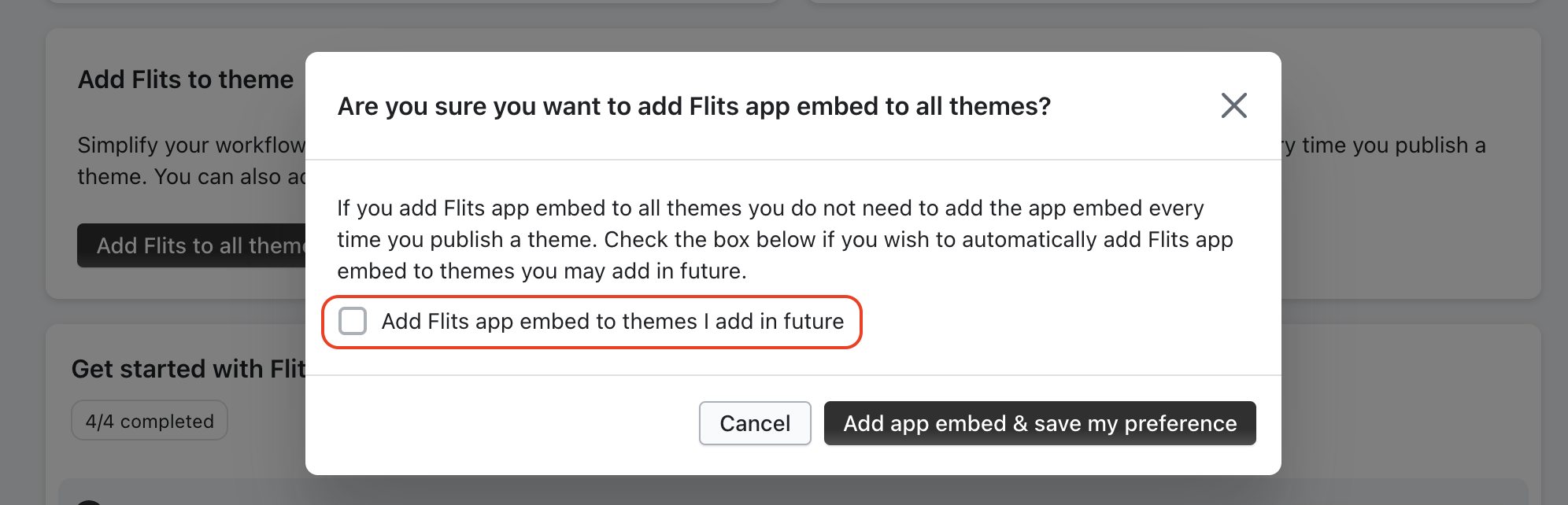 You will also see an option to automatically apply Flits to any new themes added in the future. To activate this option check "Add Flits app embed to themes I add in future", Click "Add app embed & save my preference", and you're good to go.